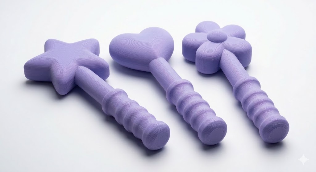 A set of three wands topped with a star, a heart, and a butterfly -- one for every magical mood. Lightweight and smooth with no sharp edges, these wands are ready for spellcasting, wish-granting, and general enchantment.
