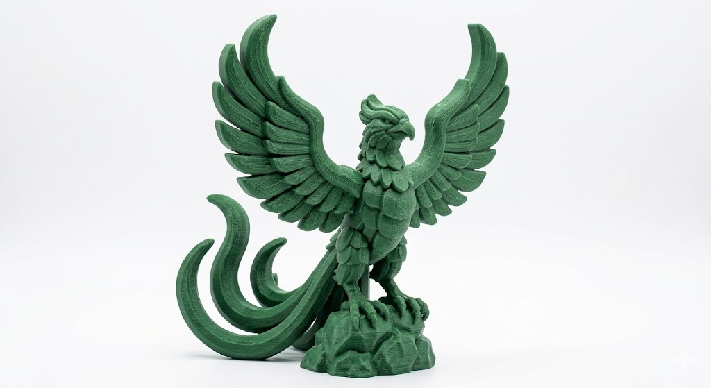 A detailed phoenix in mid-flight with fully spread wings and flowing tail feathers. This display-quality piece makes a striking addition to any bookshelf or desk, and the intricate feather detail rewards a close look.